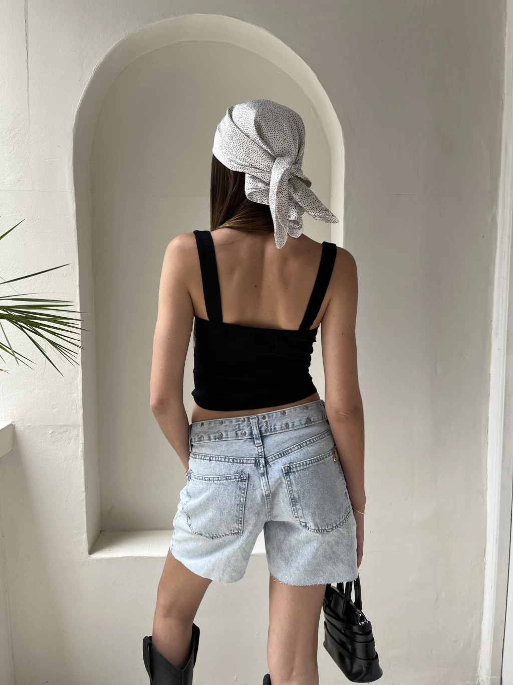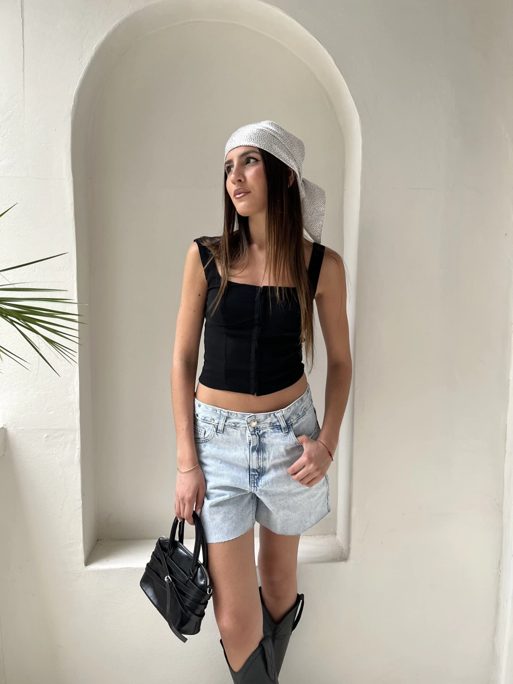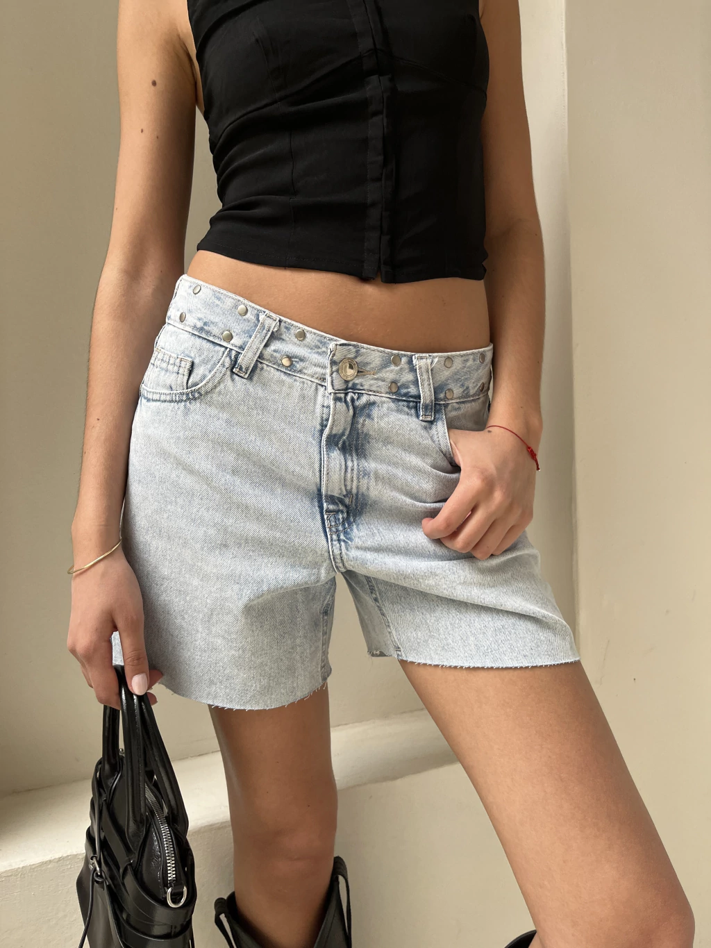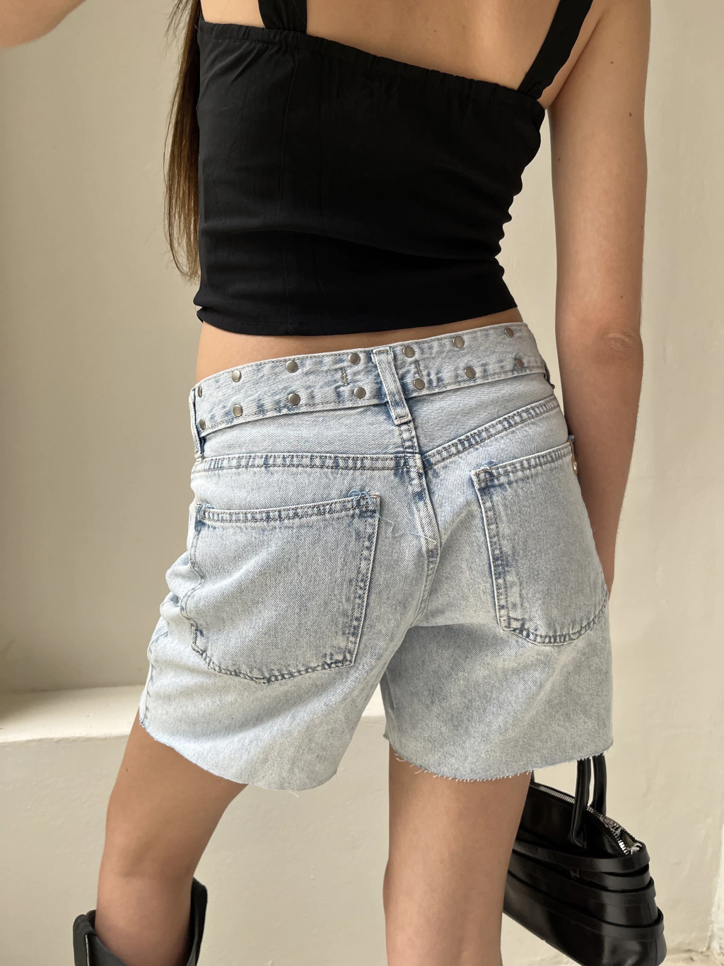 Dale estilo a tu outfit con esta bermuda celeste rígida, al corte, con tachas en la cintura que marcan tendencia, la encontras del talle 24 al 32.