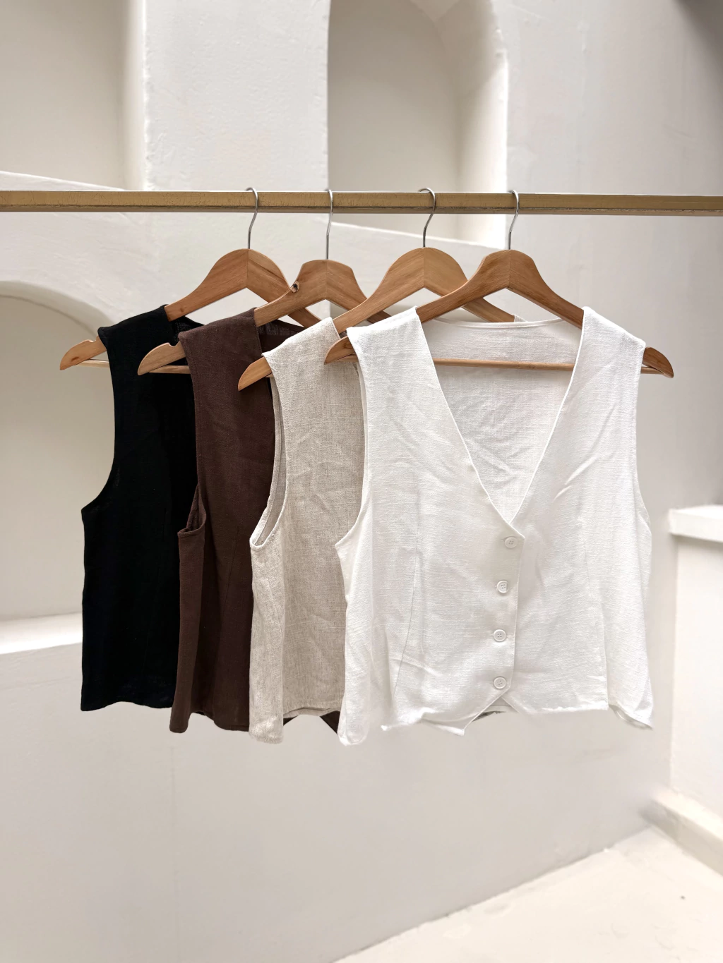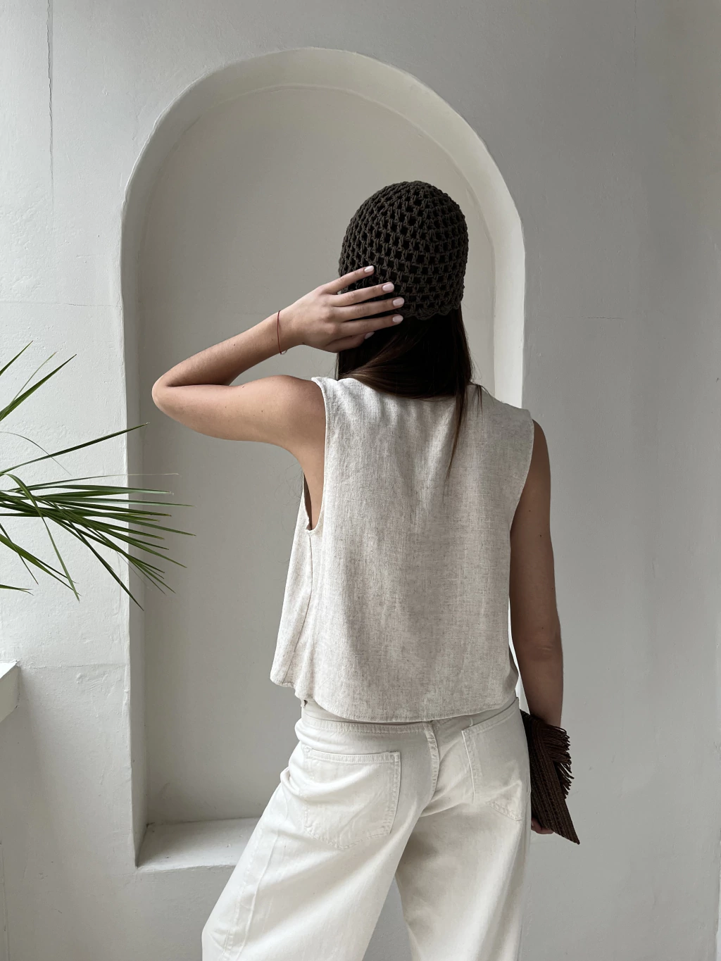 Chaleco de lino corto con una silueta limpia y sofisticada. Su textura natural, liviana y fresca aporta elegancia sin esfuerzo y transforma cualquier outfit con un toque moderno y femenino.