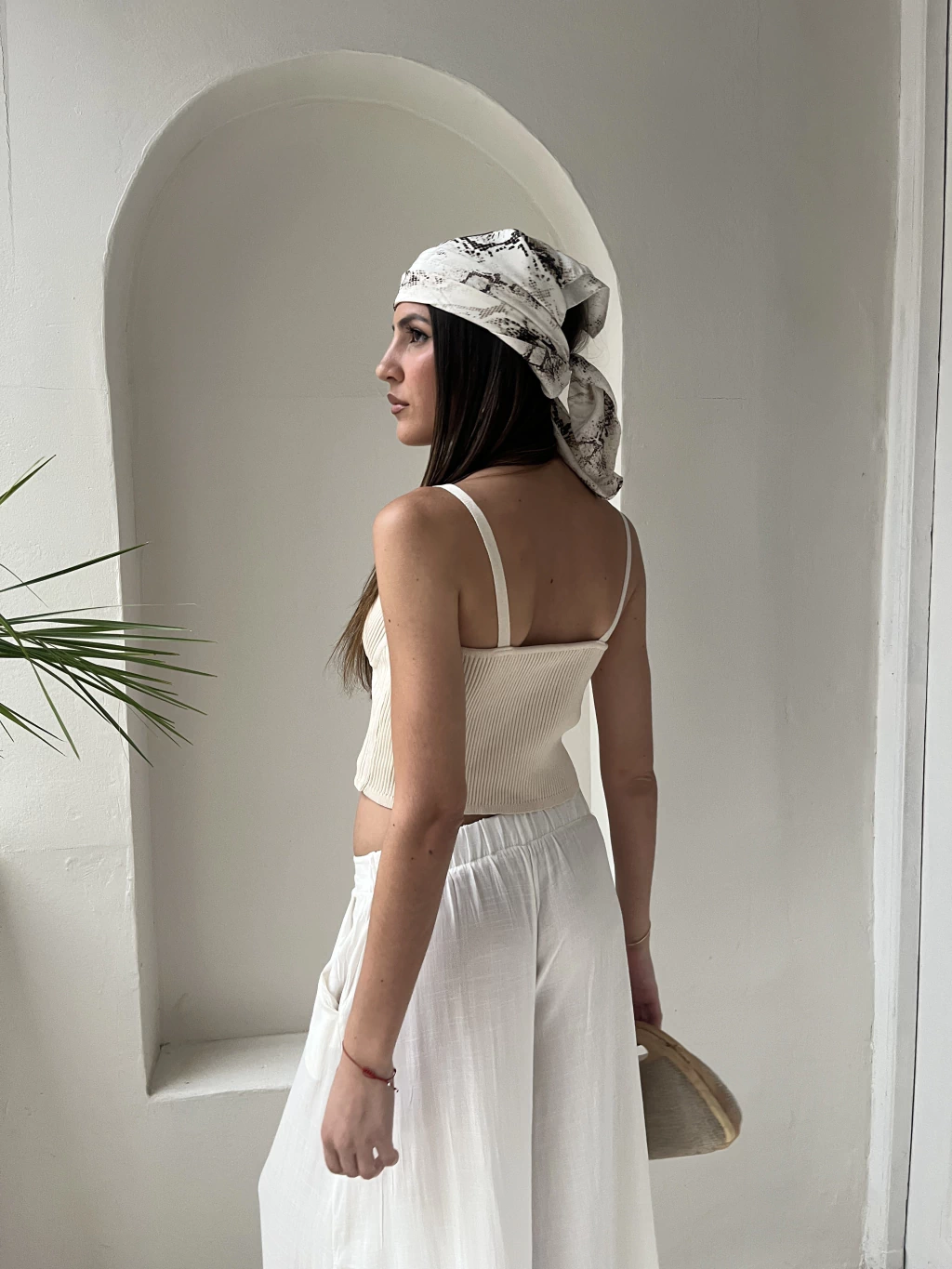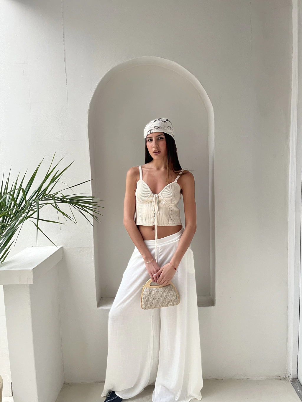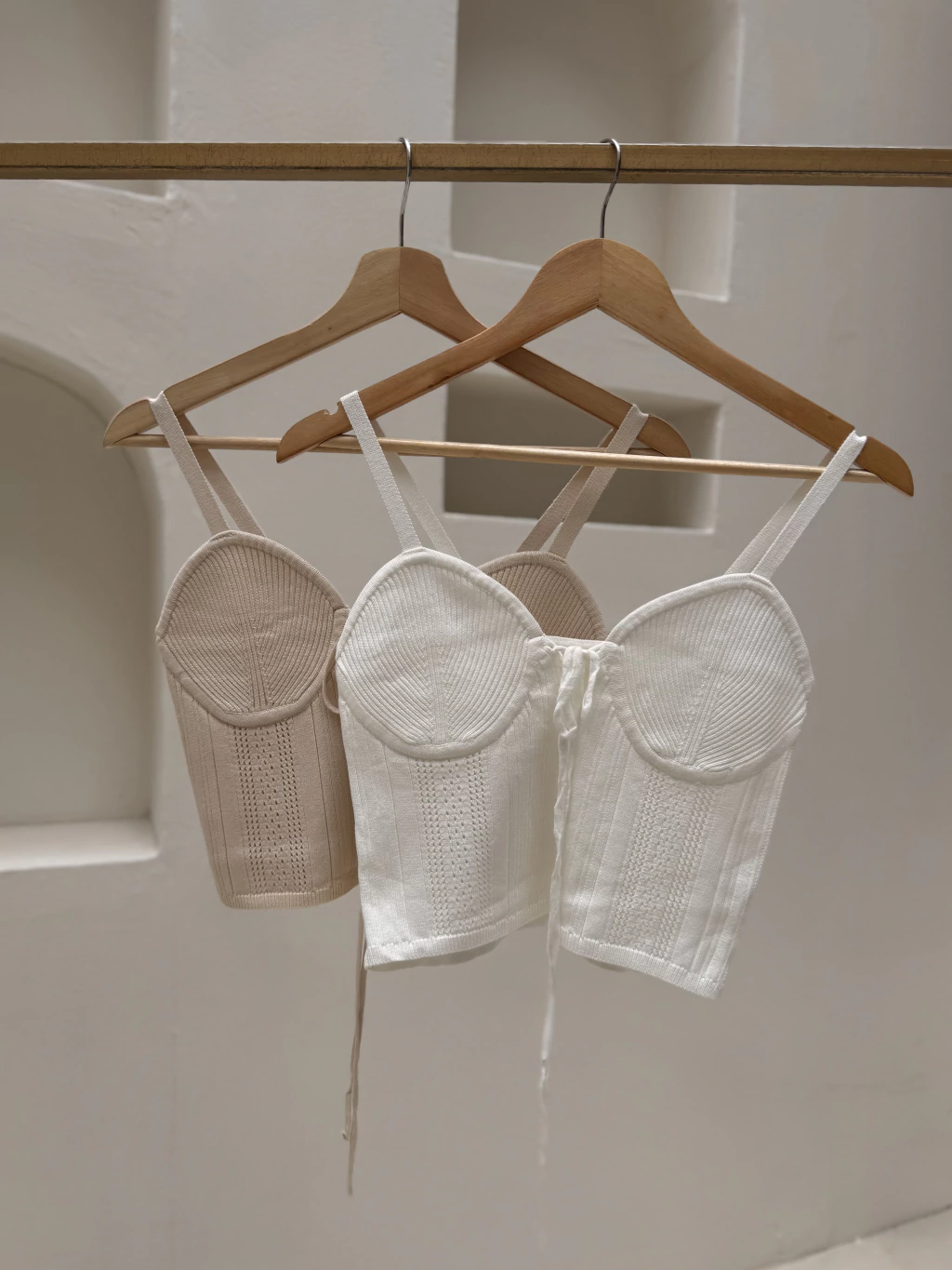 Top de hilo con diseño tipo corset que enmarca la cintura y realza el busto. Suave al tacto y con estructura sutil, aporta un look elegante y femenino sin perder comodidad.