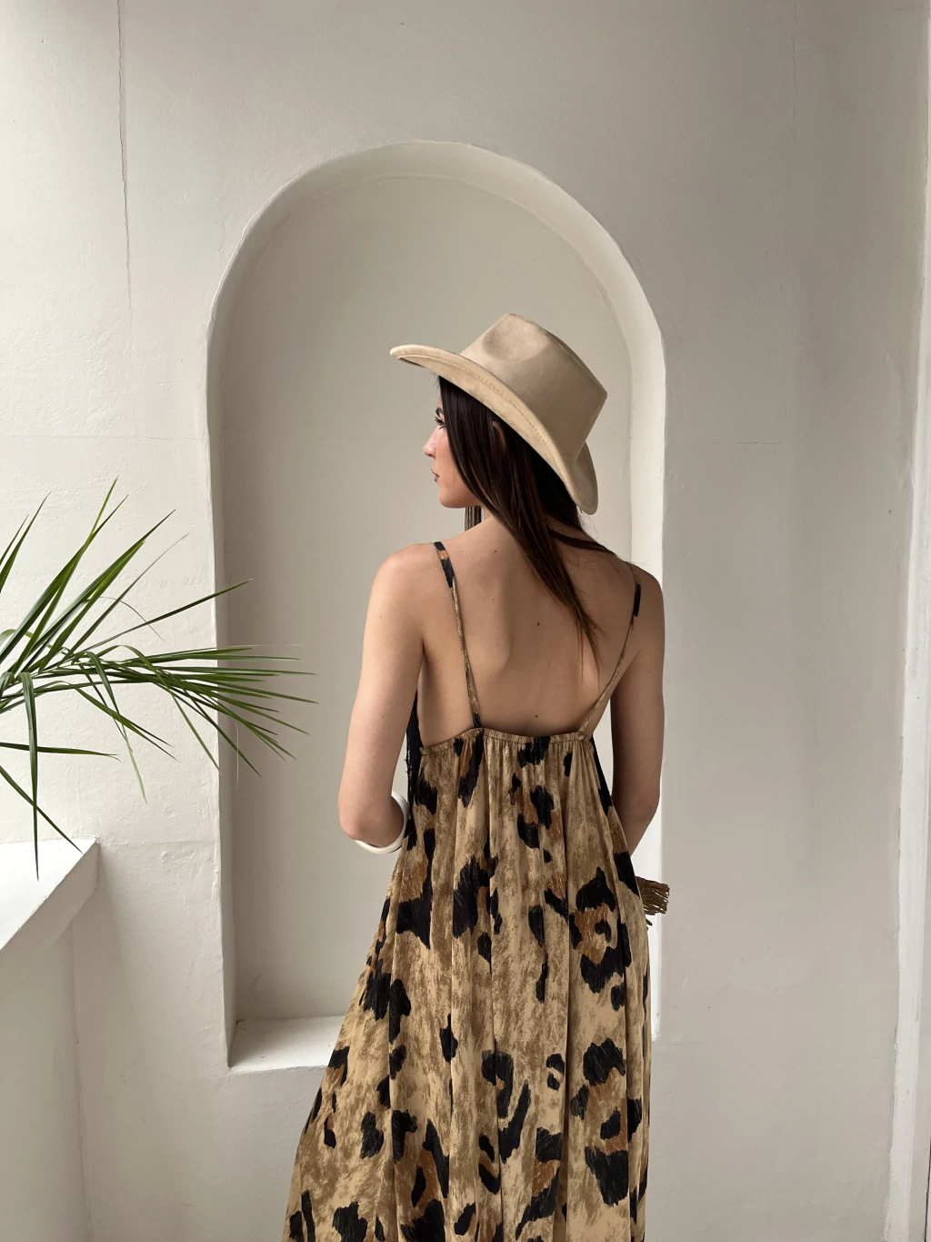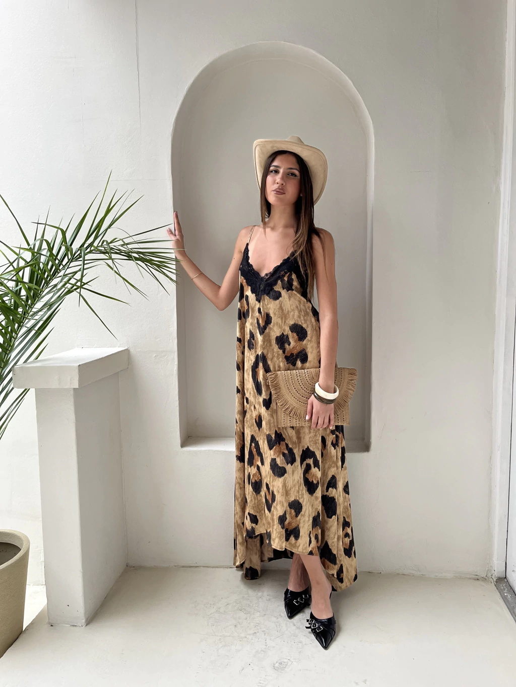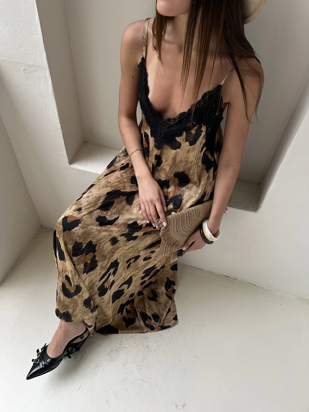 Vestido largo en satén estampado con delicada puntilla en el escote. Su textura suave y brillo sutil realzan la silueta con un estilo femenino y sofisticado para cualquier ocasión especial.