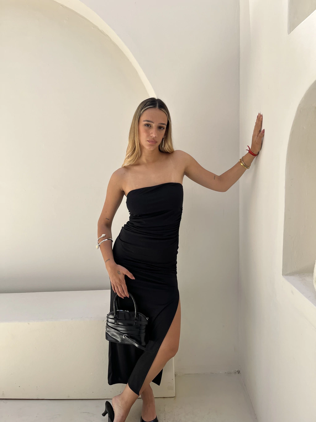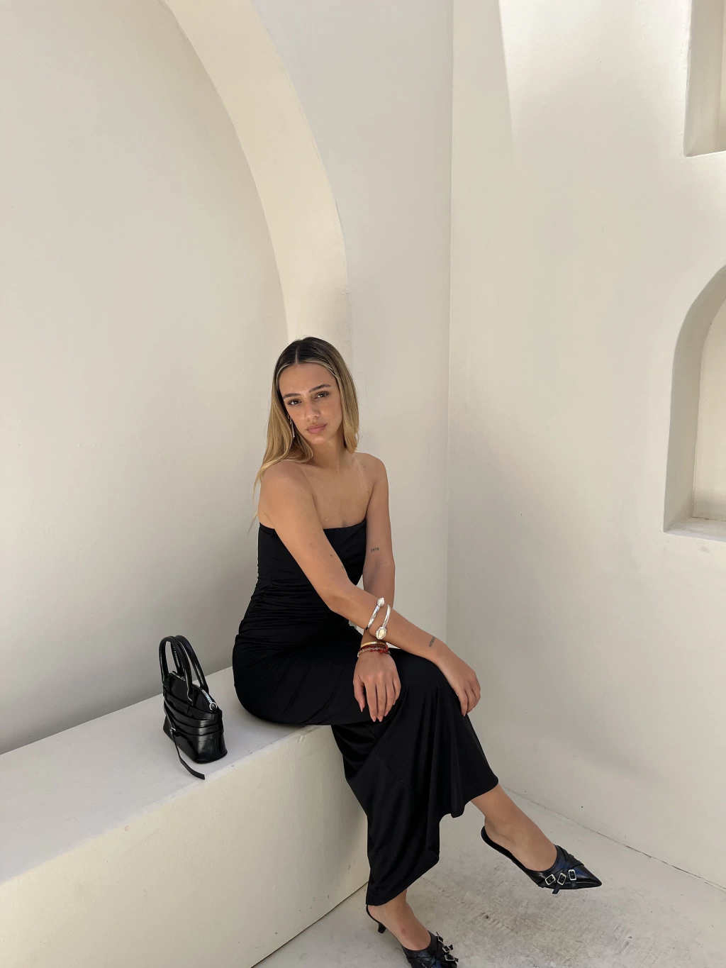 Este vestido largo strapless con frunce y glitter combina elegancia y diversión, perfecto para destacar en cualquier ocasión especial.