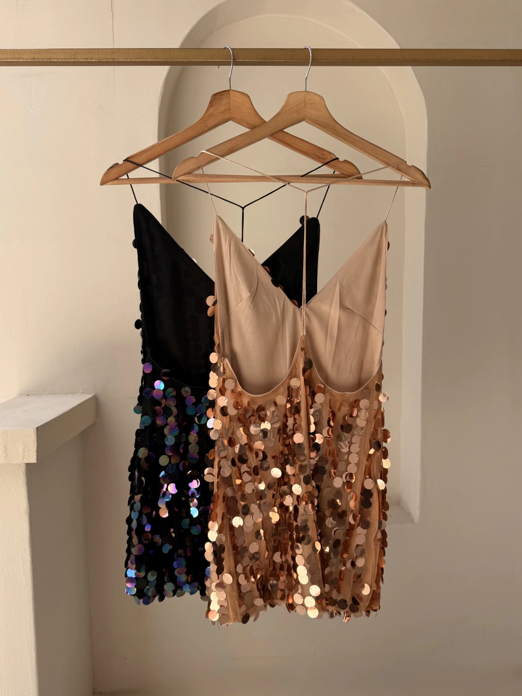 Vestido corto de lentejuelones grandes, con bretel tipo colita de ratón. Una prenda deslumbrante que combina glamour y tendencia.